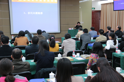 报告会上,吴晶从侨的定义、侨民的产生、中国华侨溯源、改革开放后的出国潮、浙江华侨的历史出发,深入浅出的讲诉了浙江华侨的发展史。随后,她从国家与侨民的关系,世界各国的侨民工作角度,讲诉了侨民对国家的各种关系和影响。
