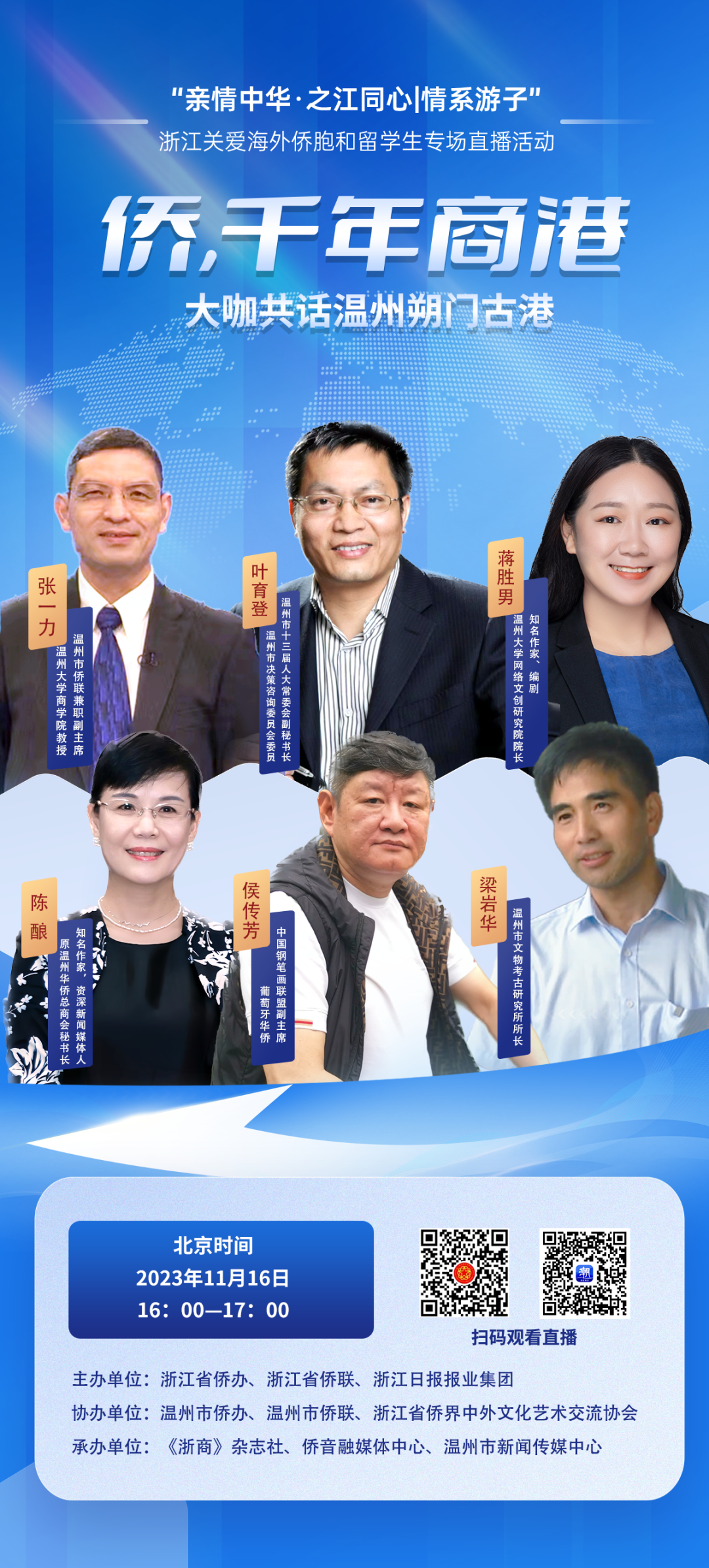 扫描下方二维码或者点击阅读原文观看完整回放视频千年商港,幸福温州。北京时间2023年11月16日下午16:00—17:00,亲情中华·之江同心|情...